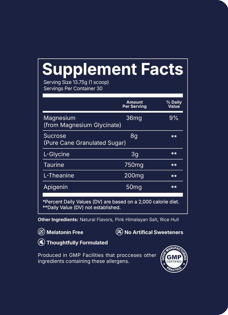 Vegan, melatonin-free formula with apigenin, L-Theanine, magnesium, and Glycine to regulate your rhythm. 30 servings per jar—just scoop, stir, and sip.